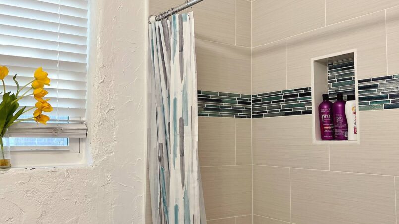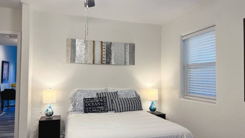 The bedroom features a queen-size bed with a firm, brand-new BeautyRest mattress and a second Smart TV. A dedicated work desk makes it easy to stay productive during longer stays. You’ll also enjoy the stunning walk-in shower, beautifully finished with new tile.